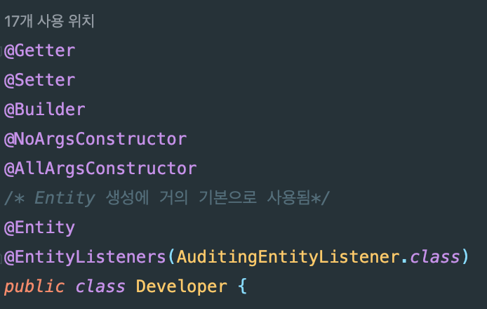 그 외에 필요한 정보들을 작성해주었다. 필드 내의 entity들은 각각의 활용성에 맞게 어노테이션을 붙여주도록 하자.
