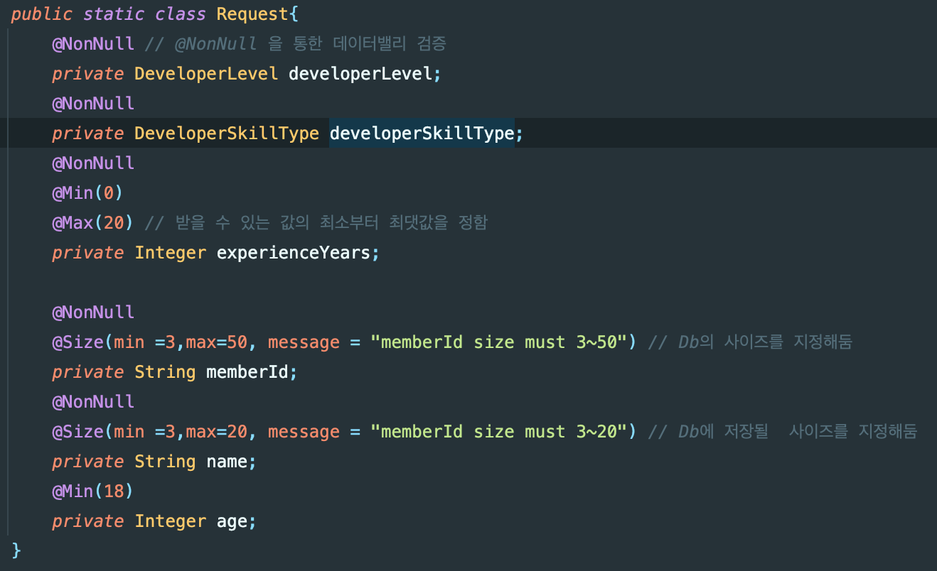 CreateDeveloper 내에서 상수 클래스를 각각 Request, Response를 만들어 데이터를 주고받게끔 구현해주었다.
