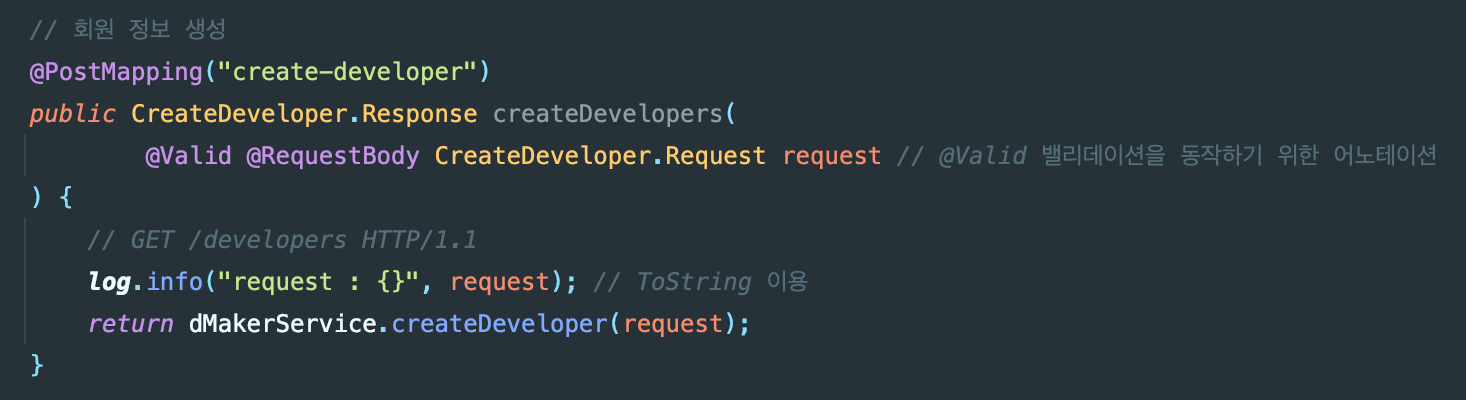 @Valid를 선언하여 CreateDevelopr의 밸리데이션을 사용할 수 있게끔 해주었다, 위에서 선언한 Slf4j, ToString을 통해 로깅을 간편하게 처리하였고 받은 요청 값을 Service에 넘겨준다.