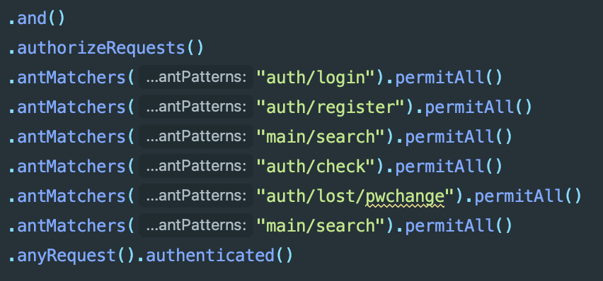 분명 위 맵핑 주소는 접근 허용을 전체에게 해뒀음에도 불구하고 계속 접근에 대해 검증을 시도하는 것 이였다. 구글링 해도 뭔가 답답하고 제대로 해답이 나오지 않아 미친듯한 삽질을 시작해봤다. 개발하고 있는 코드가 문제일 수도있단 생각에 코드를 갈아엎어보기도 해봤지만 사실 접근문제는 코드문제가 아니기에,, 그래서 Config로 들어가 뭐가 문제일까 열심히 생각을 해보았다.