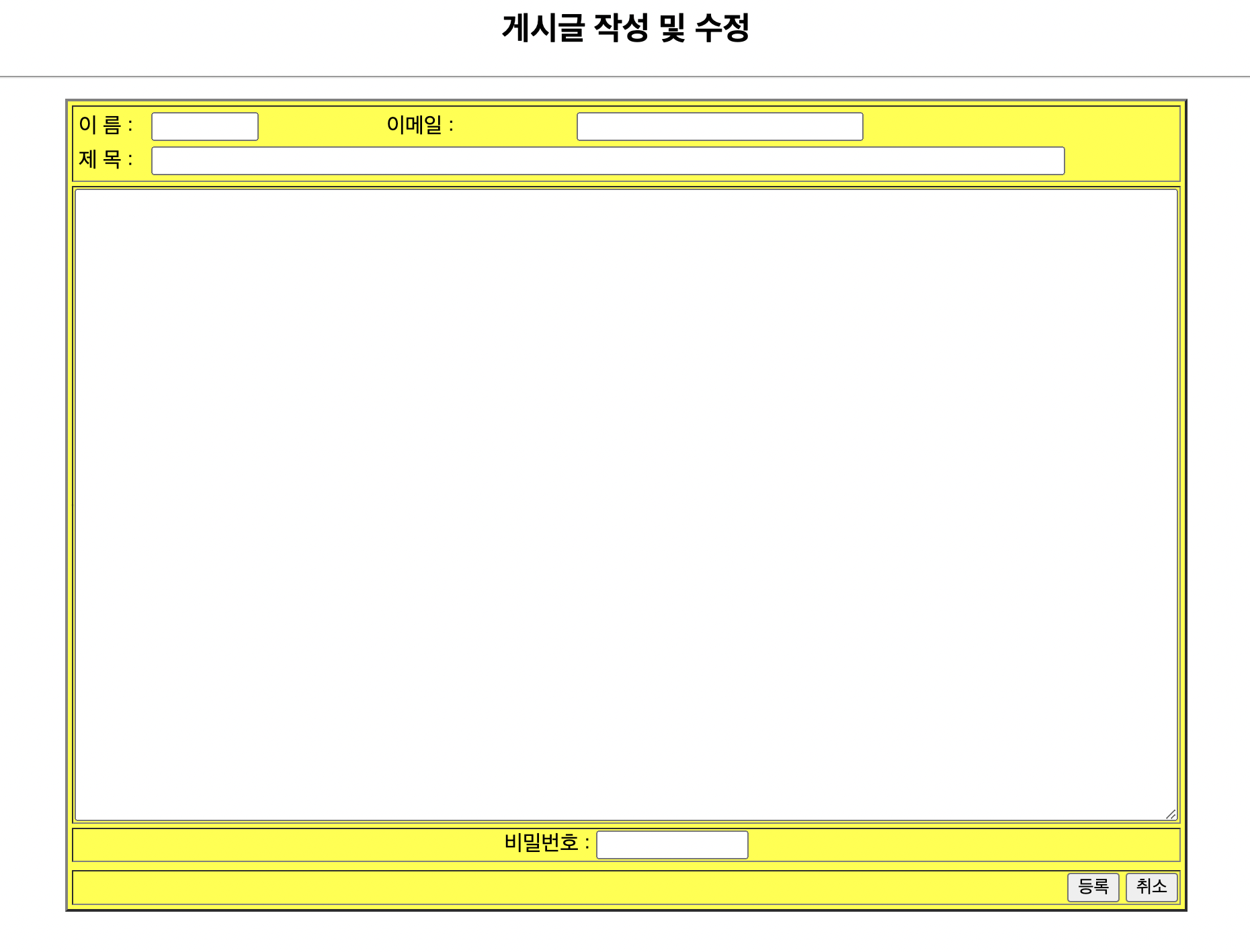이름과 이메일을 입력받고 제목 및 글의 내용, 그리고 수정 및 삭제를 위한 비밀번호까지 입력을 받은 후 어떠한 버튼이 눌렸냐에 따라 noticeScript.js로 넘어가 함수를 실행 후에 noticeInfo.jsp로 넘어가 mysql에 데이터 베이스로 저장되는 구조를 가지고 있다. 또한 게시글 작성하기가 아닌 수정을 했을 경우 버튼은 등록, 취소가 아닌 수정, 삭제, 취소로 나누어져 있다. 그렇다면 게시글을 작성 후 noticeList가 어떻게 변화하는지 보도록 하자!