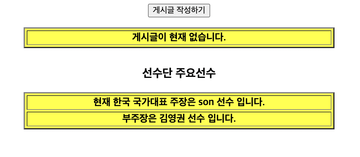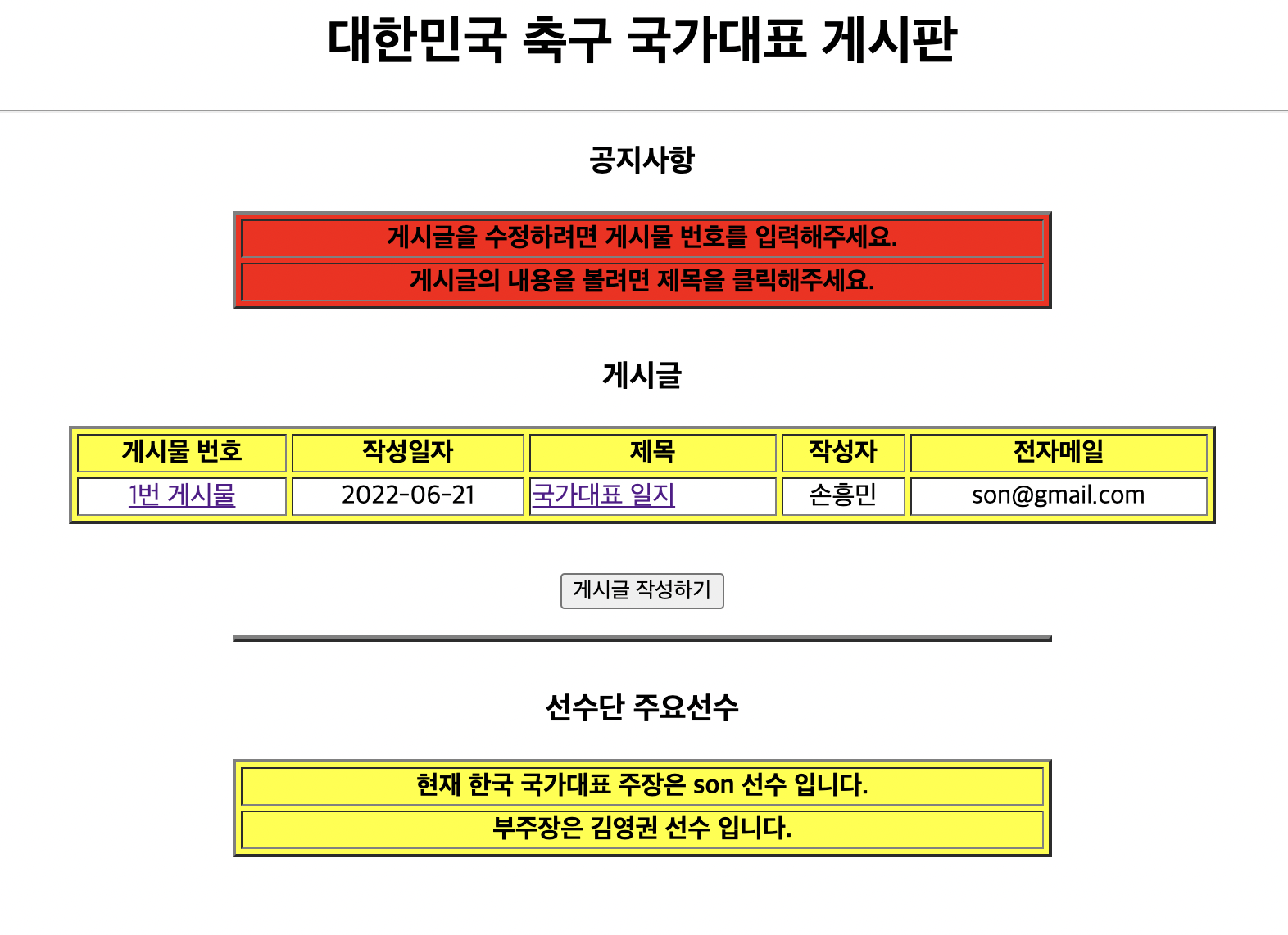 게시글이 작성되면 위의 [게시글이 현재 없습니다.]라는 테이블이 사라지고 공지사항이 생기게 되는데 이 역시 JSTL IF를 통해 작동되고 있다. 테이블을 생성 시에 id값에 AUTO_INCREMENT를 설정해두었기에 자동으로 1번 게시물이 된 것을 볼 수 있고 작성일자 정보 또한 잘 가지고 왔으며 입력받은 값들이 정확하게 게시글에 구현되어 있는 것을 확인할 수 있다.