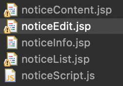 다음으로는 JSP 파일 구조에 대해 알아보도록 하자 ! 현재 게시글의 목록들을 보여줄 noticeList.jsp와 Parameter 값을 이용하여 정보를 처리해줄 noticeInfo.jsp, 게시글의 내용을 알려줄 noticeContent.jsp, 게시글의 작성 및 수정을 하는 페이지인 noticeEdit.jsp로 총 4가지 jsp 파일로 구성되어있으며 간단한 함수를 처리해줄 noticeScript.js라는 자바 스크립트 파일 1개가 있다.