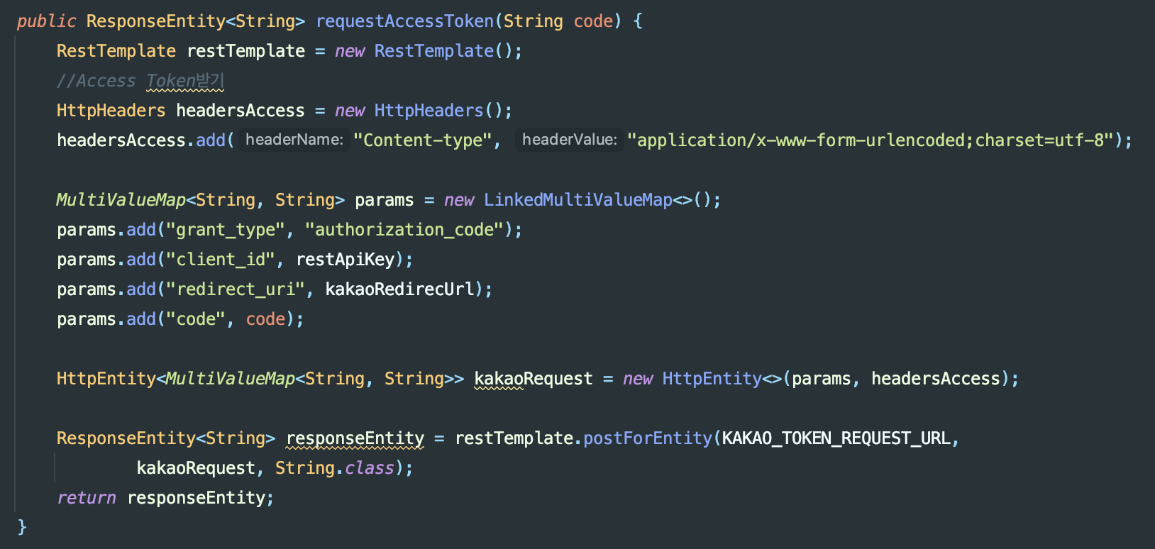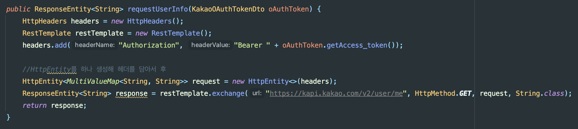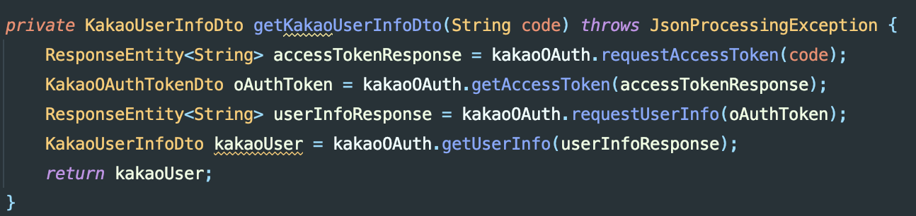 이것도 구글 로그인과 마찬가지로 일련의 처리과정을 거치는 메서드를 구현해주었다. 마지막 return은 과정을 전부 거친 후 나오는 카카오의 유저 정보를 return 해준다. 그렇다면 이번에도 한 줄씩 kakaoOAuth 클래스의 메서드들이 어떤 로직을 가지는지 살펴보자!