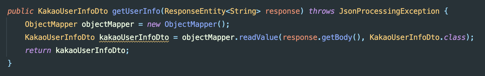 이것도 구글 로그인 때와 똑같이 Dto를 하나 생성해 담아주면 자바 객체로 변환이 되며 Dto를 return 해주면 된다.