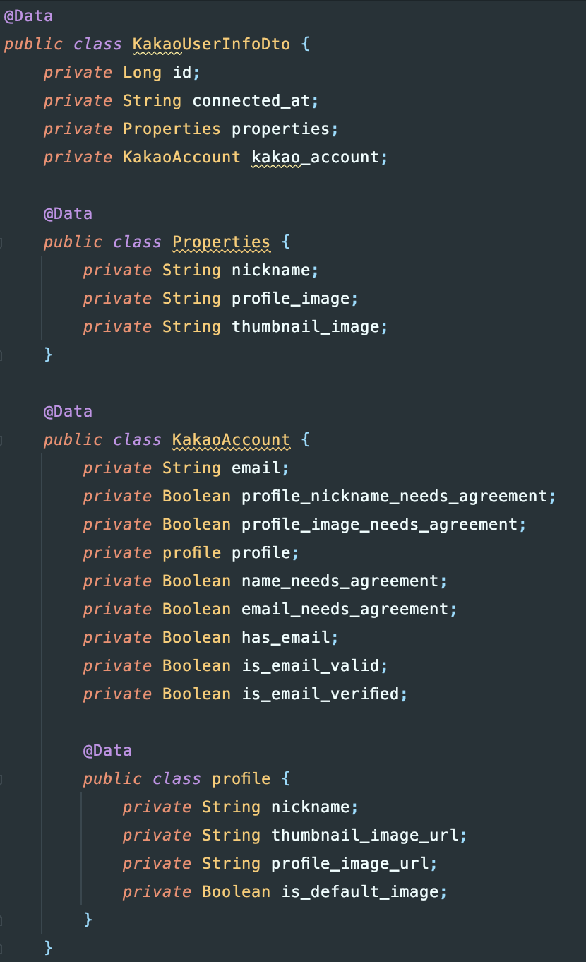 return 해준 값에서 body를 가져와서 우리가 유저 정보를 받기 위한 Dto를 생성해 안에다 담아준 이후에 return 해준다. 그렇다면 이제 우리는 카카오 로그인 및 유저 정보를 가져오는 데 성공하였다! 아래는 Dto 코드이다.