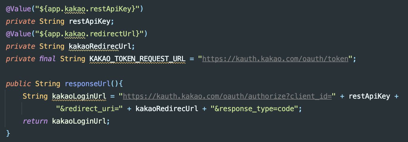 저번 구글 로그인과 마찬가지로 카카오 로그인 창으로 redirect 해줄 것인데 방법은 동일하다 kakaoOAuth라는 클래스를 따로 생성해 responseUrl 메서드로 return을 준후 위 Get 반응을 일으켜 redirect 해줄 것이다. 메서드는 아래와 같다.