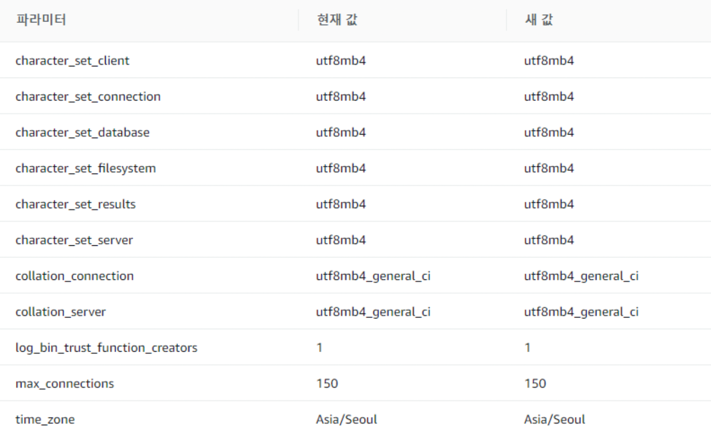 그리고 위의 파라미터 값을 현재 값->새 값으로 설정 후 생성하면 된다. 설정하는 방법은 검색창에 해당 파라미터 검색 후 값을 변경해주면 마무리된다.