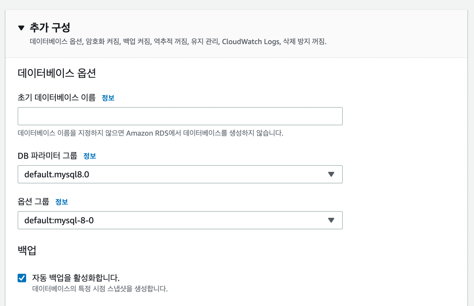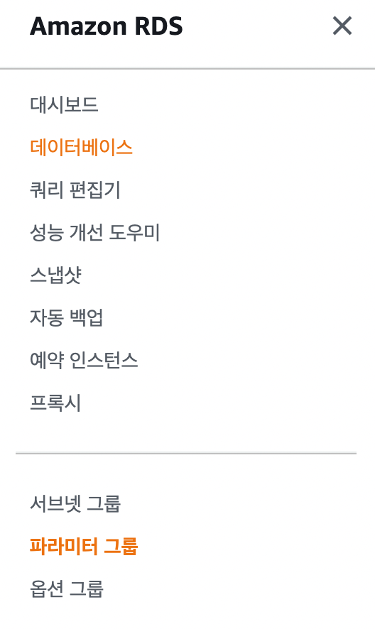 이후에 아래에 있는 데이터베이스 생성을 클릭해주면 RDS가 생성이 된다. 생성했으니까 끝났다고 생각하면 오산. 파라미터 그룹을 초기에 하나 생성하여 나머지 설정들을 끝내주도록 하자.
