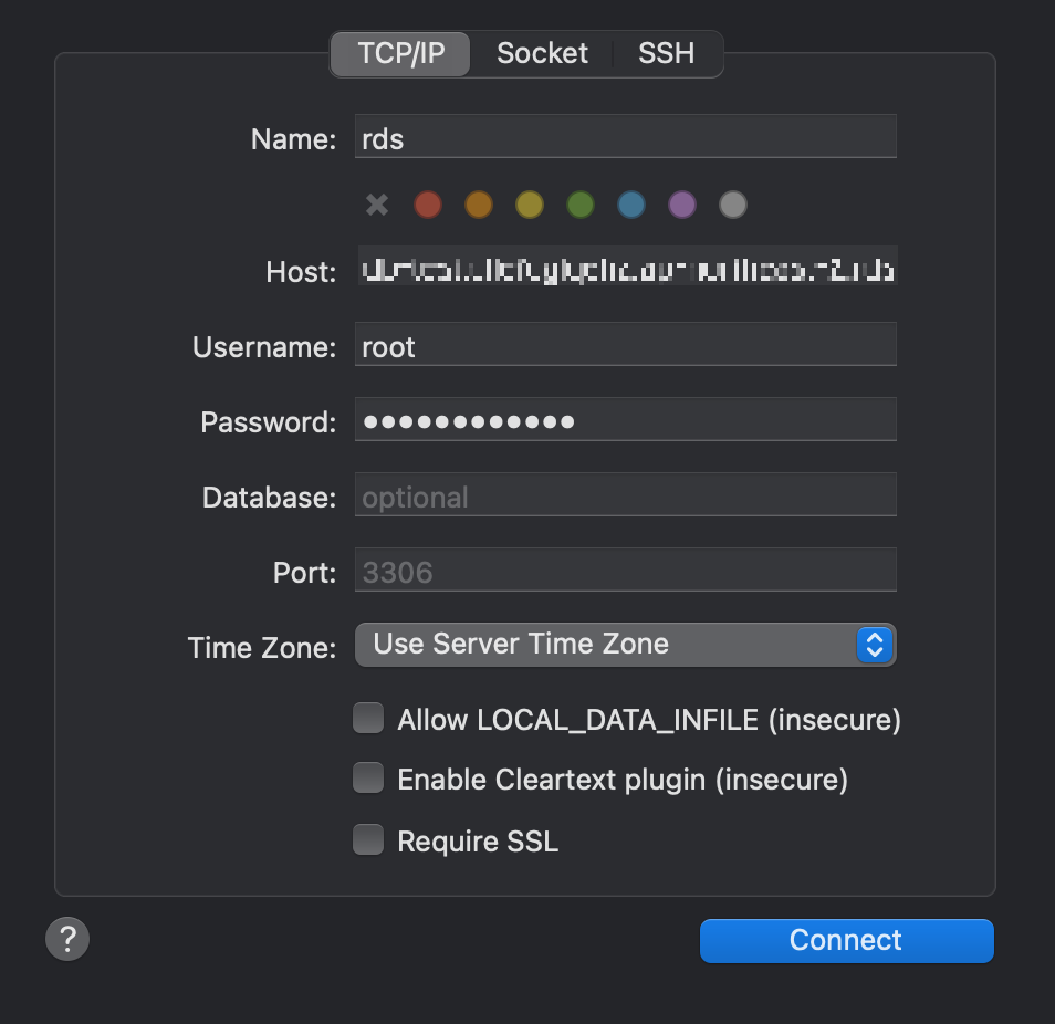 name은 아무거나 설정해주고 Host에는 발급된 엔드포인트 / 유저네임과 패스워드는 RDS 생성할 때 설정한 것들을 입력해주면 정상적으로 접속이 될 것이다.