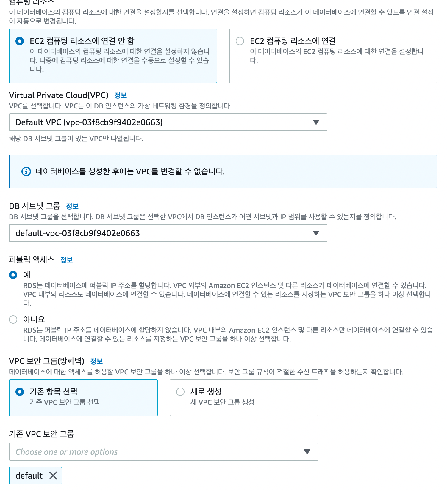 EC2는 수동으로 설정하면 돼서 굳이 연결을 해줄 필요 없다. 그리고 퍼블릭 액세스는 꼭 "예"로 설정을 해주도록 하자. 안 그러면 로컬이 연결이 안 된다.. 보안 그룹은 기존에 있는 거 선택해주고 없으면 생성! 이후에 수정해줄 거다.