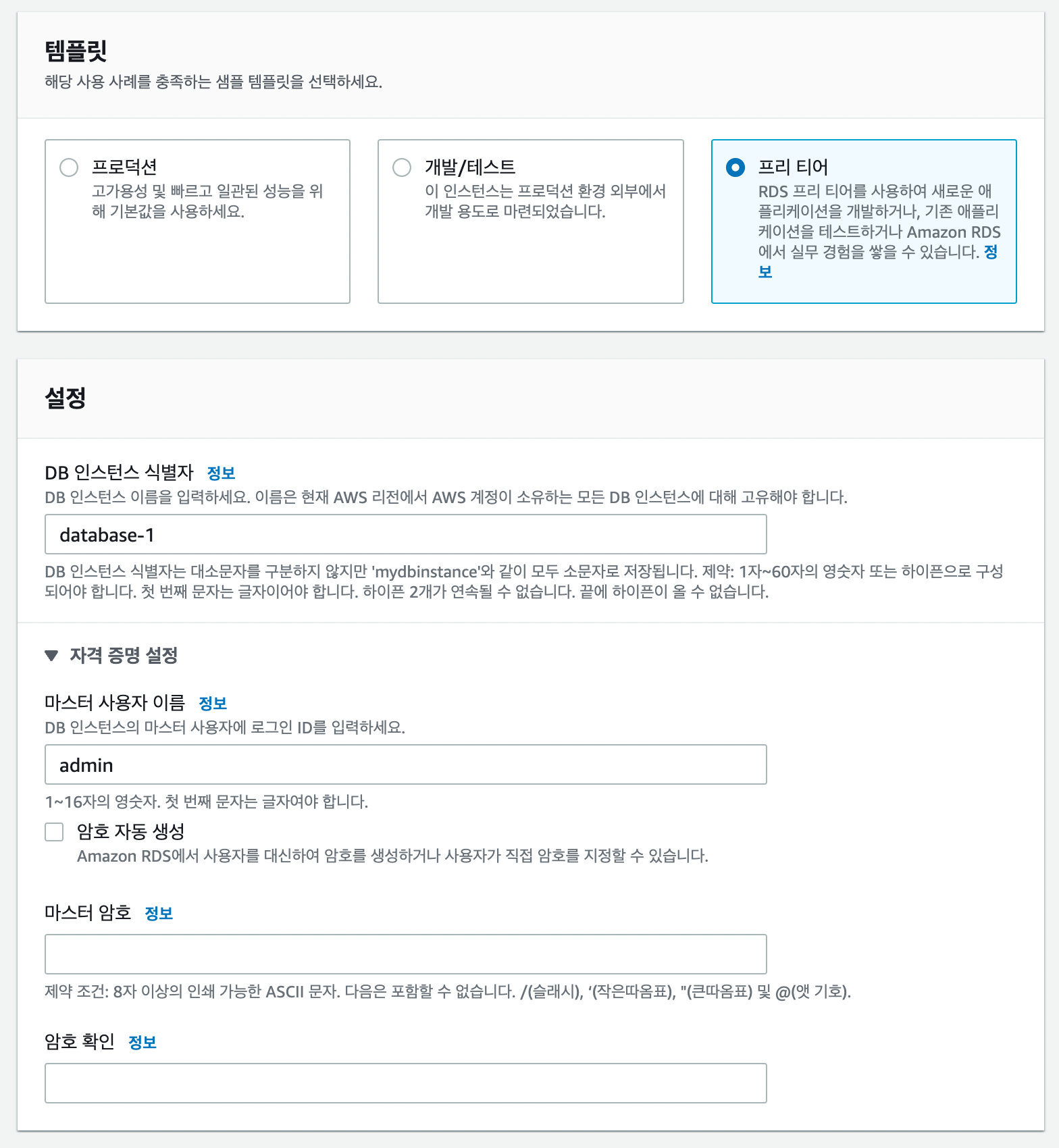 우리는 무료로 이용할 것 이기 때문에 프리티어 버전을 선택해주고 DB 인스턴스 이름을 설정해준다.