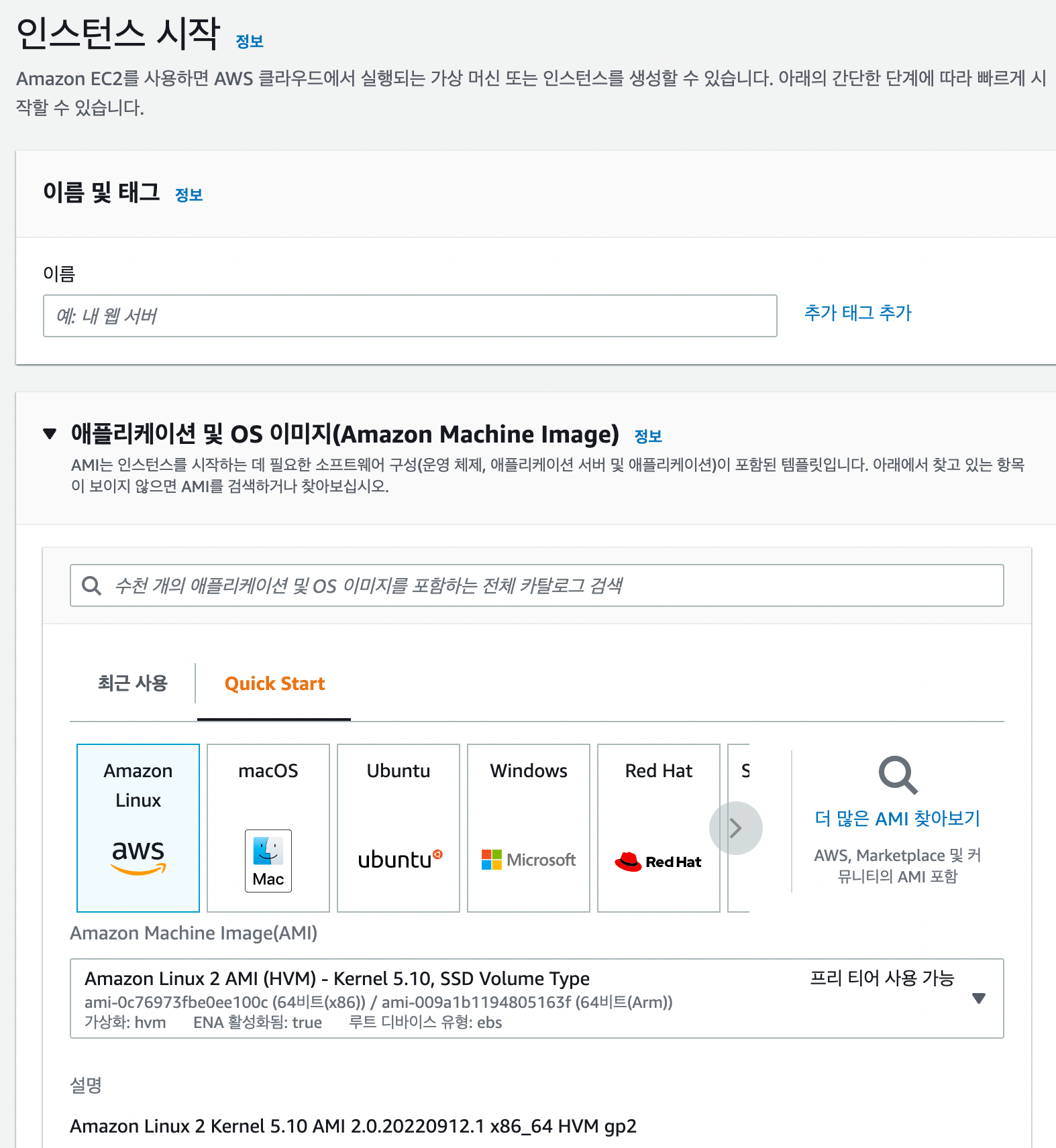 위와 같이 인스턴스를 생성하는 페이지로 이동한다. 이름은 자신이 원하는 대로, 우리는 Amazon Linux를 사용한다 -> 프리티어도 지원 가능!