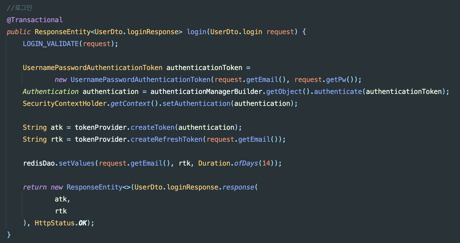사실 로그인과 토큰 재발급을 나눠서 진행하려 했는데, 로그인 API가 사실 회원가입과 크게 다를 부분이 없어서 한꺼번에 다루기로 했다. 회원가입에서 save만 빠지면 사실상 로그인이기 때문에 복습 겸 다뤄보도록 하자. 회원가입 편을 보고 온다면 이해가 더 빠를 것 이기 때문에 한번 보고 오는 것을 추천한다.
