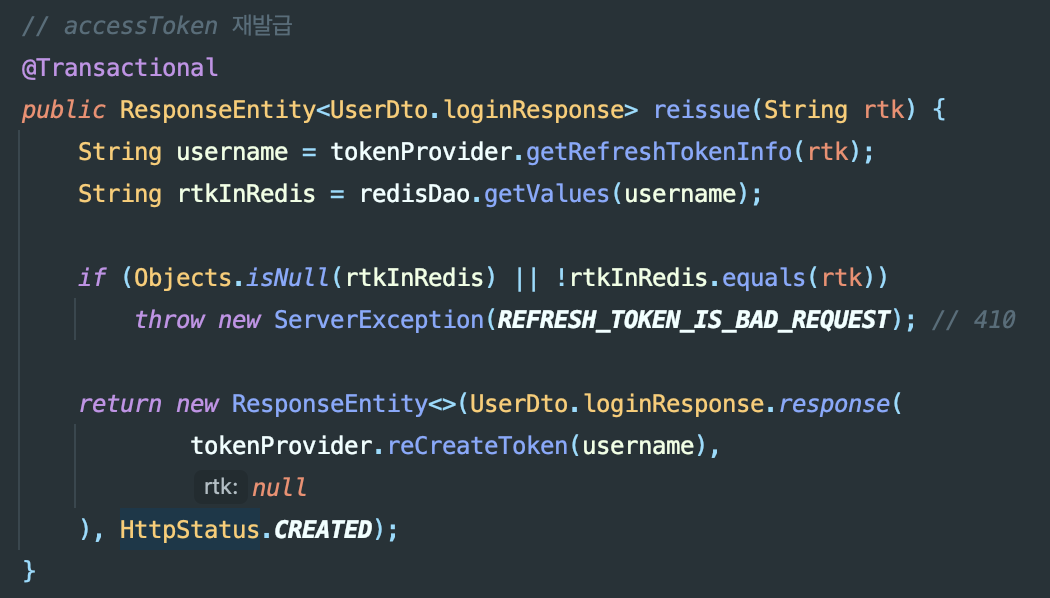 rtkInRedis에 담은 정보를 토대로 검증을 진행하는데 null이거나 redis에 저장된 RefreshToken과 사용자가 요청한 RefreshToken이 다른 경우 throw를 던지며 410 상태 코드를 보내준다, 다만 에러코드의 경우 개발자와 클라이언트가 조율해서 더 나은 상태 코드로 구현하도록 하자.