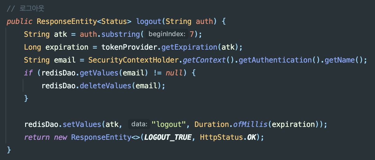 그 후 SecurityContextHolder에 등록되어있는 유저 정보를 가져와 이메일을 담아주고 redis에 해당 이메일로 키값이 설정된 value값 RefreshToken이 존재하는지 확인해주고 있다면 삭제해준다.