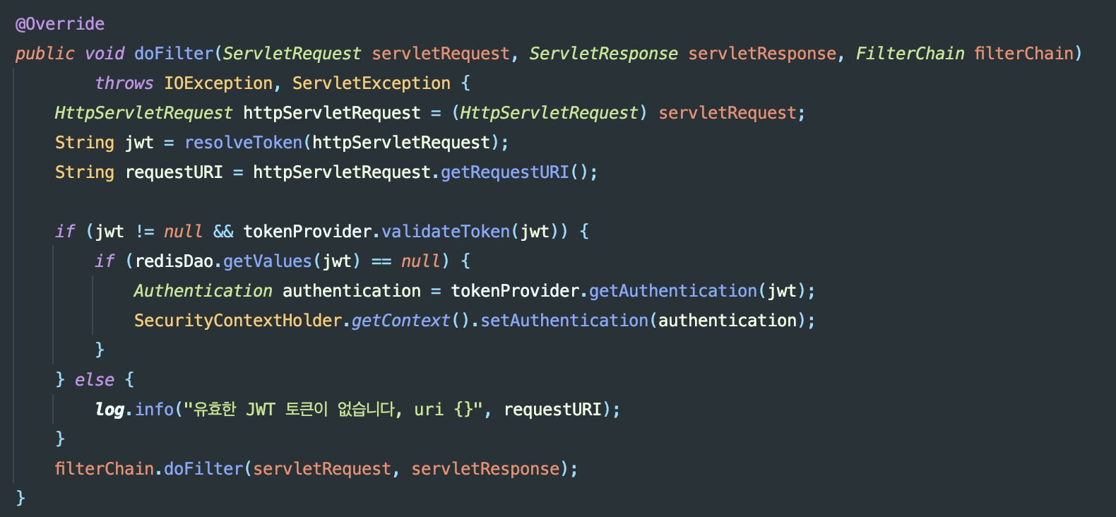 GenericFilterBean을 상속 받은 클래스에서 Override 받은 doFilter에서 추가적으로 구현해주었다. jwt가 정상적으로 헤더에 들어가 있을 경우에 redis에서 해당 토큰이 getValues를 통해 블랙리스트에 등록되어있는지 확인해주는 코드가 추가되었다. 토큰이 redis에 저장되어있는 경우는 블랙리스트이기 때문에 존재하지 않아야 정상적으로 로그인 정보를 등록할 것 이기 때문에 null 인 경우에만 정상적으로 SecurityContextHolder에 authentication을 등록해줄 것이다.