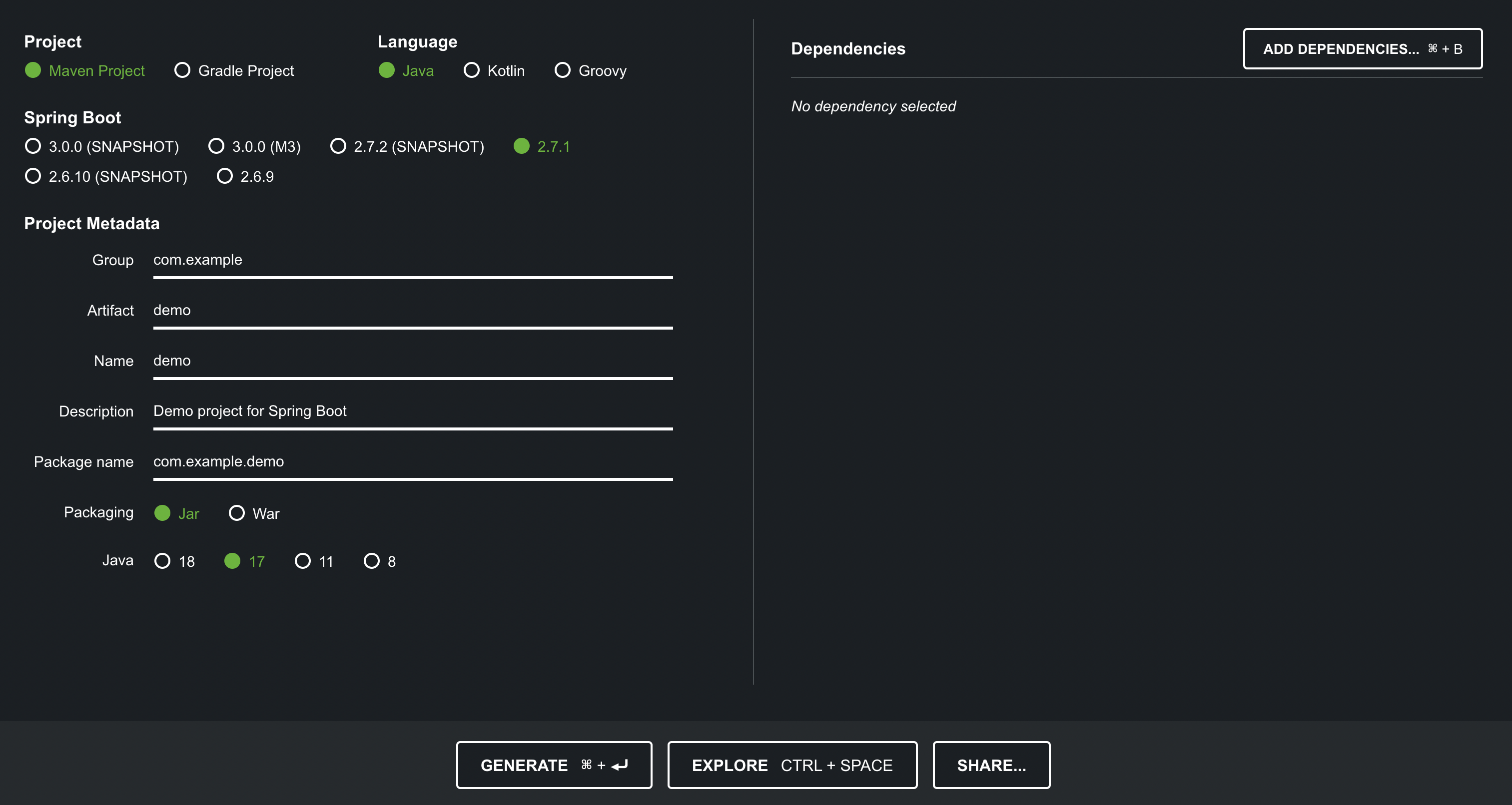 Spring Boot의 버전은 2.7.1, Java 버전은 17 버전을 사용하며 Dependencies는 내가 개발할 목적에 맞추어 추가하도록 하겠다.